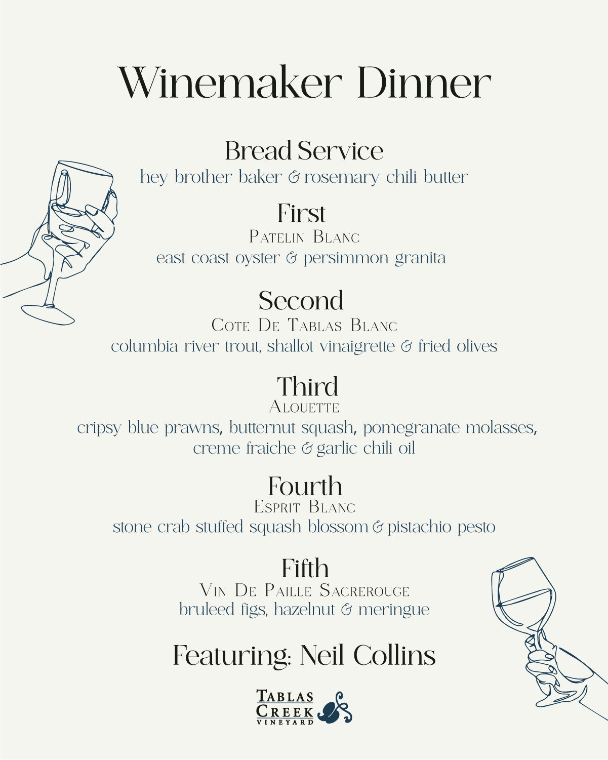 During this special two-hour dinner, Neil will share insights into Tablas Creek’s approach to sustainable farming, regenerative viticulture, and the artistry behind each wine. Guests will enjoy a thoughtfully paired five-course menu from Liv’s Oyster Bar, showcasing fresh, local ingredients alongside Tablas Creek’s Rhône-inspired wines.