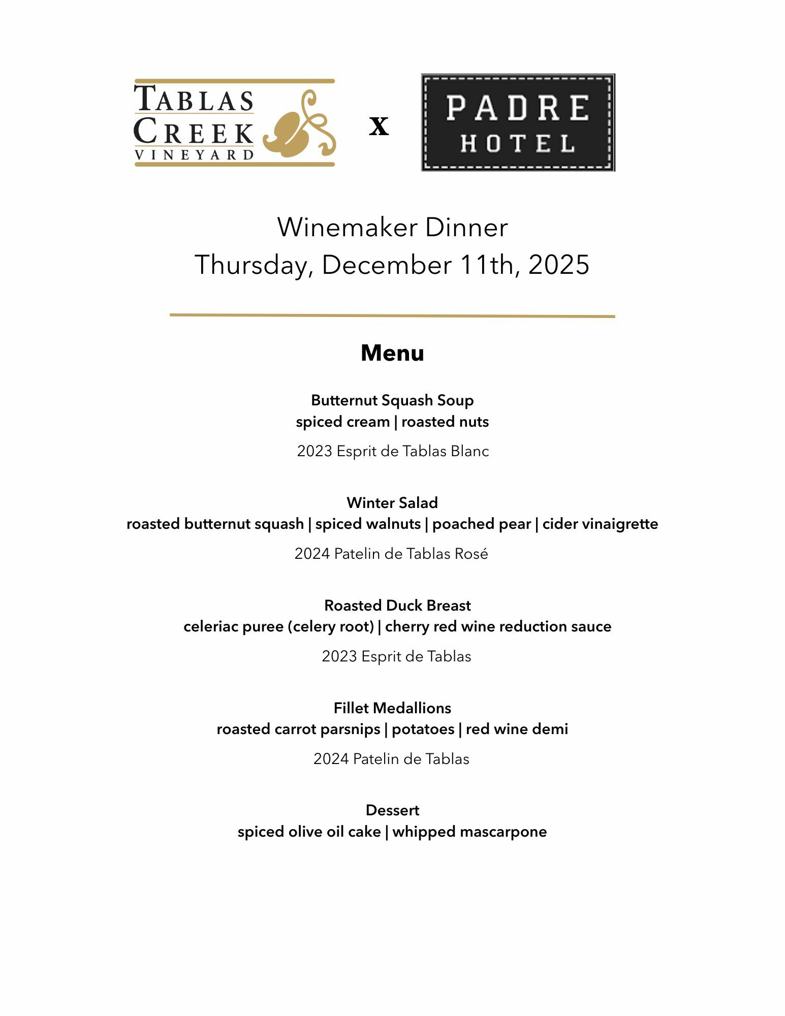 The four-wine, five-course dinner includes highlights like butternut squash soup paired with 2023 Esprit de Tablas Blanc and fillet medallions with roasted carrot parsnips and potatoes paired with 2023 Esprit de Tablas, both poured out of magnum. You can view the full menu here.