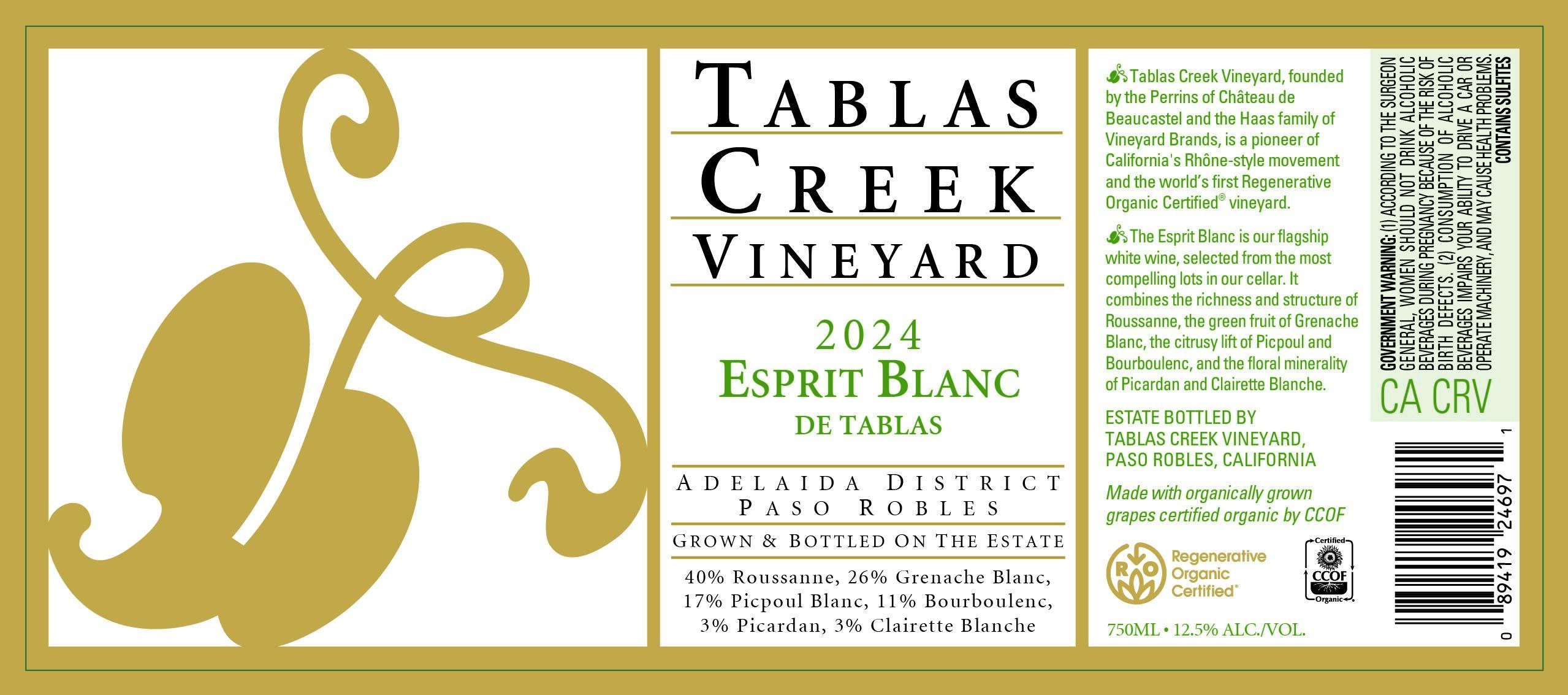 The Tablas Creek Vineyard 2024 Esprit de Tablas Blanc is our flagship white blend, chosen from the top lots of six white Rhône varieties propagated from budwood cuttings from the Château de Beaucastel estate. Roussanne provides the core richness, minerality, and flavors of honey and spice, while Grenache Blanc adds green apple and anise flavors, lush mouthfeel and bright acids. Picpoul Blanc adds pineapple brightness and saline minerality, Bourboulenc provides limestoney, citrusy lift, Picardan brings a little burst of acid, with mineral notes, and Clairette Blanche finishes with clean fruitiness and chalky minerality.