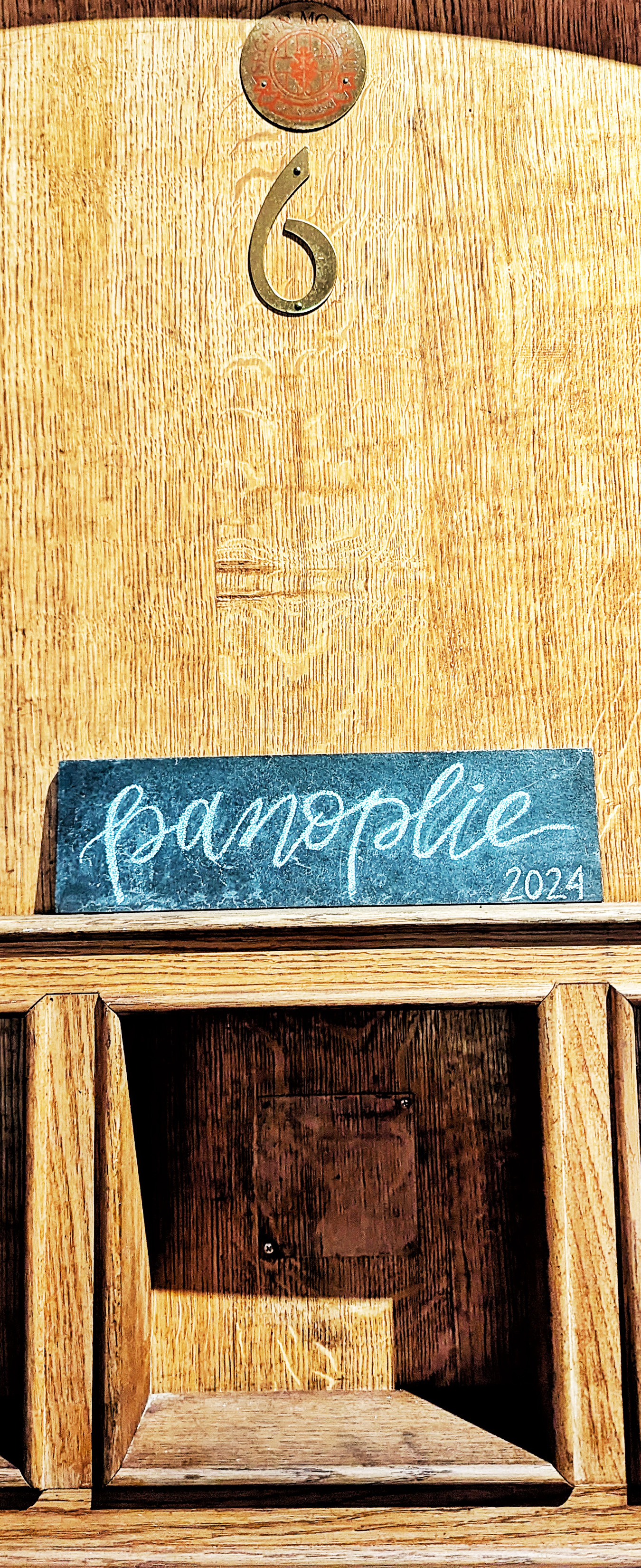 The grapes were fermented using native yeasts in a mix of 1500-gallon wooden upright fermenters, open-top tanks and closed stainless steel fermenters. After pressing, the wines were moved into barrel and allowed to complete malolactic fermentation. The Panoplie was selected from the vintage's best lots and blended in May 2025, and has been aging in 1200-gallon French oak foudres ever since. We expect to bottle the wine in August 2026.