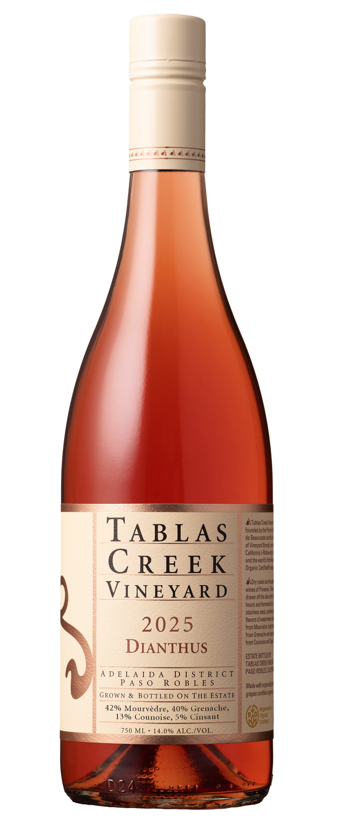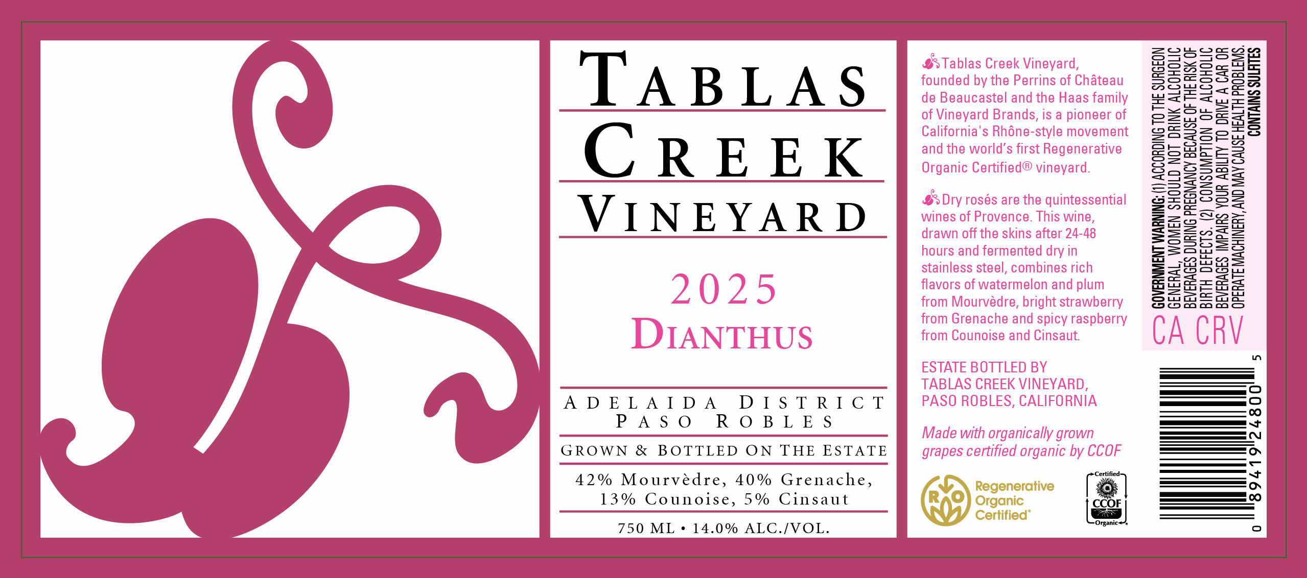 The Tablas Creek Vineyard Dianthus 2025 is a blend of four estate-grown varieties propagated from budwood cuttings from the Château de Beaucastel estate. The blend incorporates the rosé traditions of the southern Rhône, taking its Mourvèdre foundation from the solid, dry rosés of Bandol and incorporating the structure of skin contact from the rich, juicy Grenache-based Tavel. Dianthus refers to a genus of flowering plants known for their deep pink blossoms and known colloquially to gardeners as "pinks".